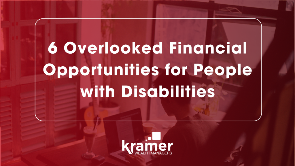 Image Description: A tinted red photo of a person sitting at his desk and typing on his laptop. In the center of the graphic is a white bold header: “6 Overlooked Financial Opportunities for People with Disabilities” and a thin white border around it. Centered at the bottom is the Kramer Wealth Managers logo.