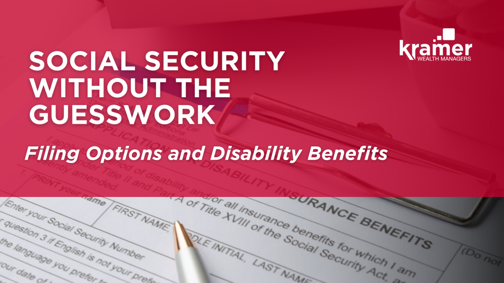 Image Description: The background shows a photo of a Social Security Benefits application on a clipboard. There is a red, transparent block that occupies the top three-quarters of the graphic. Inside the block is the title that reads “Social Security Without the Guesswork, Filing Options and Disability Benefits.” The Kramer Wealth Managers logo is placed on the top right corner.
